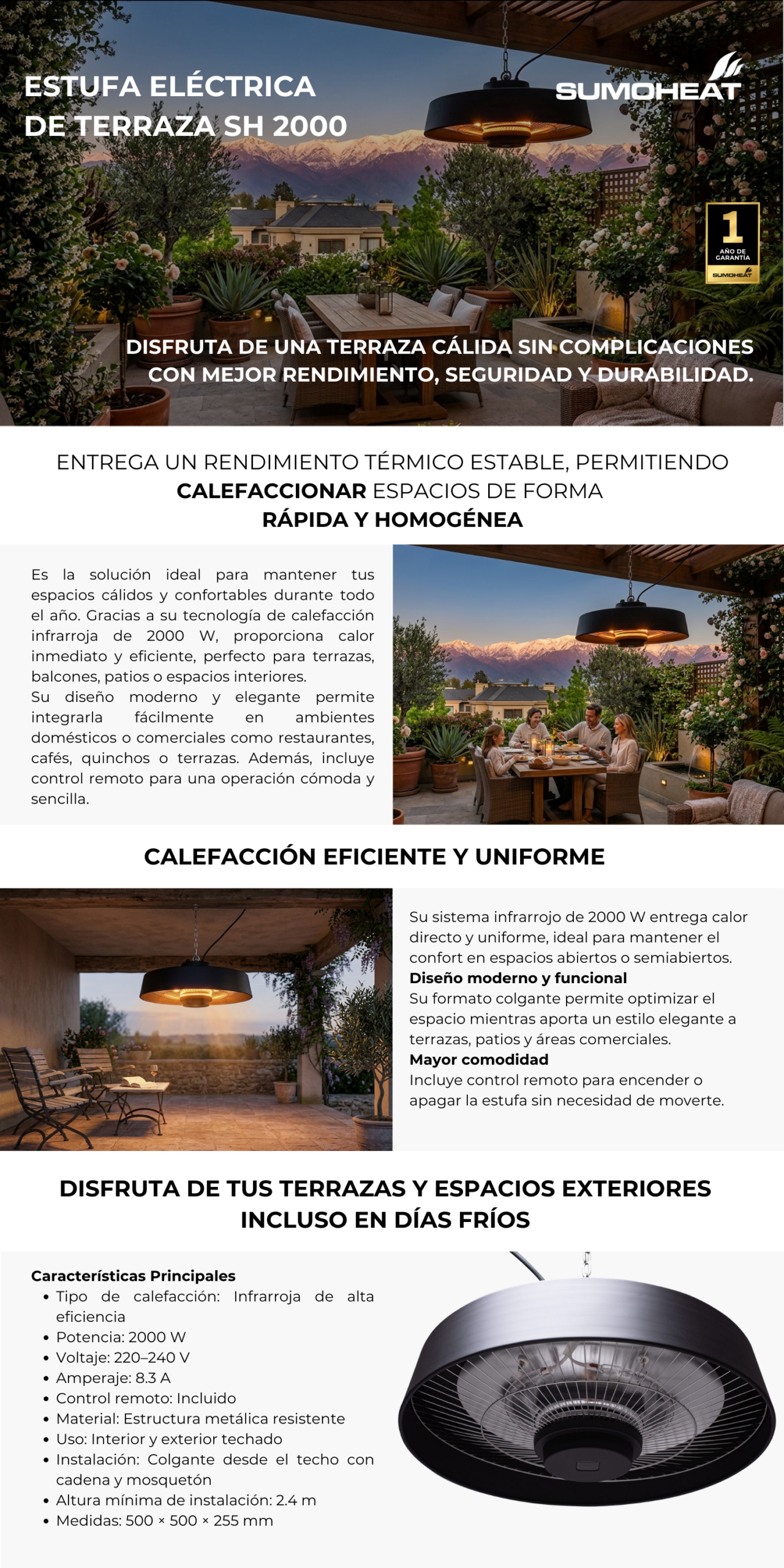 La estufa SumoHeat SH-2000 combina potencia, eficiencia energética y seguridad, ofreciendo una solución confiable para disfrutar de espacios cálidos durante todo el año.