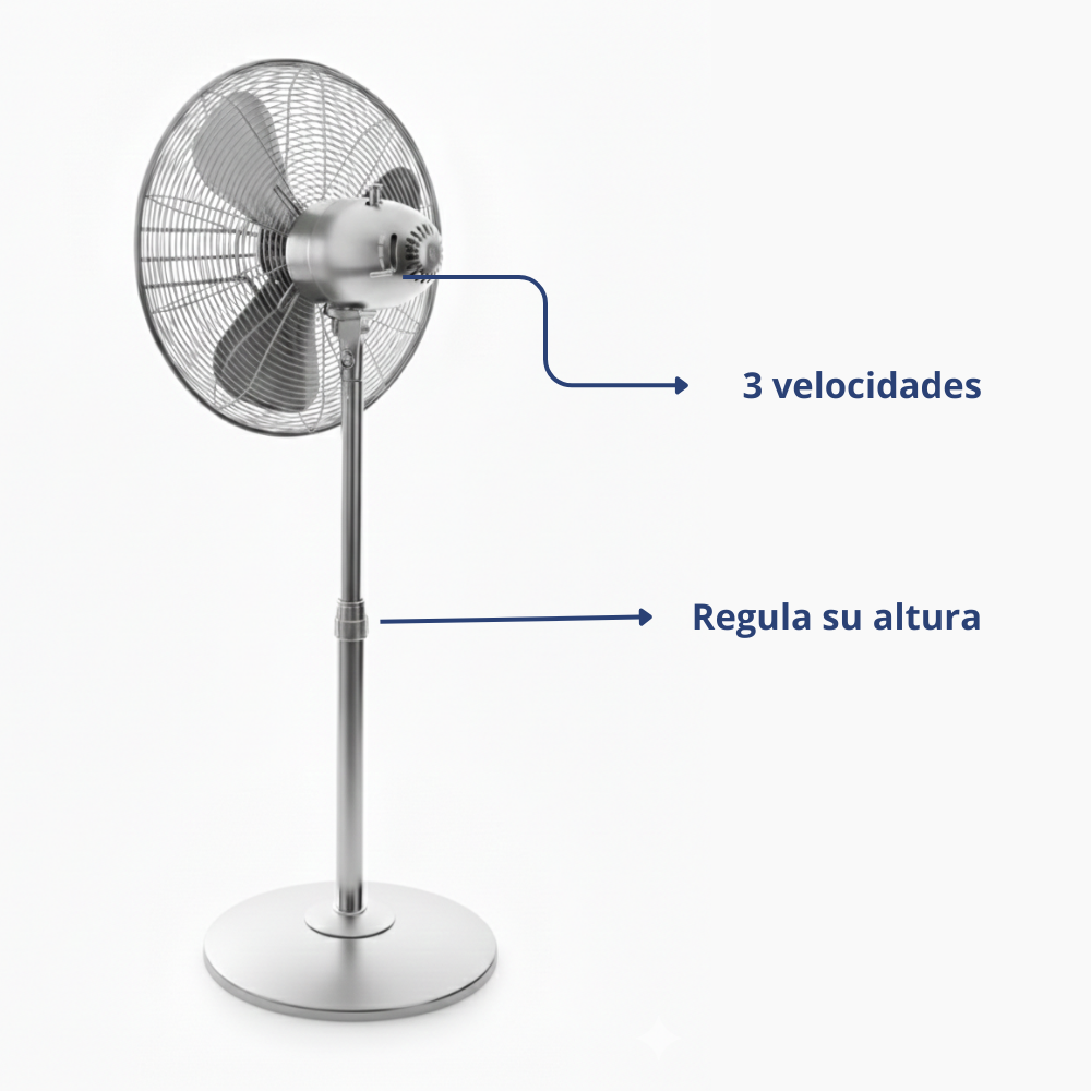 La base ajustable y la construcción completamente metálica garantizan durabilidad y estabilidad, haciendo de este ventilador una opción segura y confiable. La rejilla metálica asegura un uso seguro, protegiendo a tu familia y mascotas.
